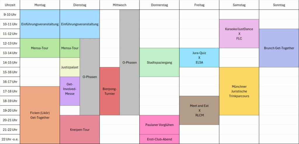 Über die ganze Woche (06. – 12.10.2025) habt Ihr die Möglichkeit an verschiedenen Veranstaltungen rund um das (Jura-)Studium, die LMU und München teilzunehmen, aber auch an sonstigen Events zum Kennenlernen wird es nicht fehlen.
